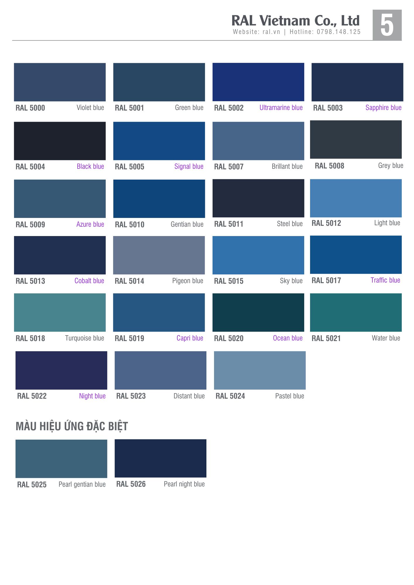 | RAL 5005 | Signal Blue | Xanh tín hiệu công nghiệp tiêu chuẩn. |