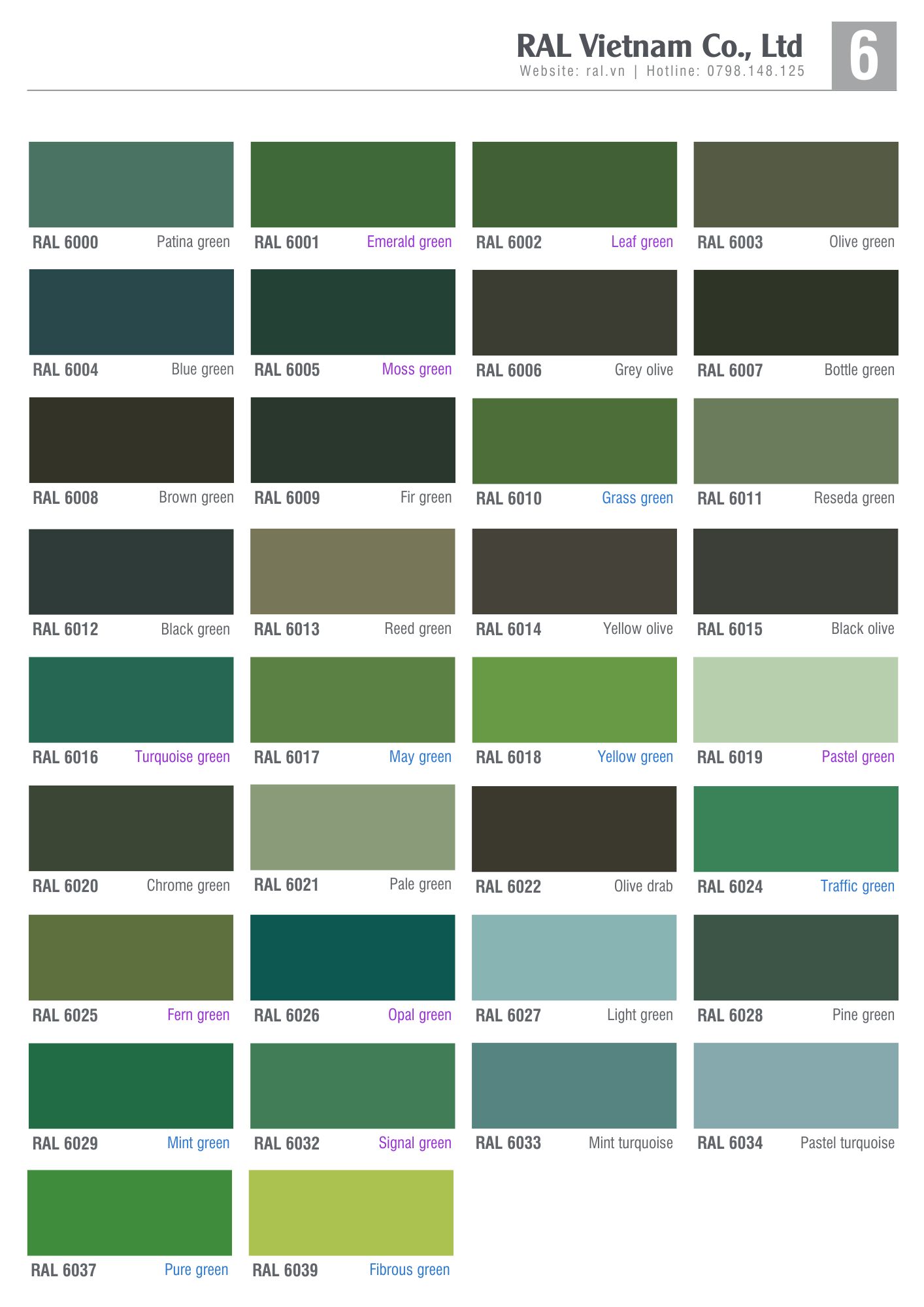 | RAL 6011 | Reseda Green | Xanh nhạt nhẹ nhàng, dùng cho phòng kỹ thuật. |